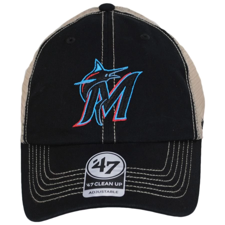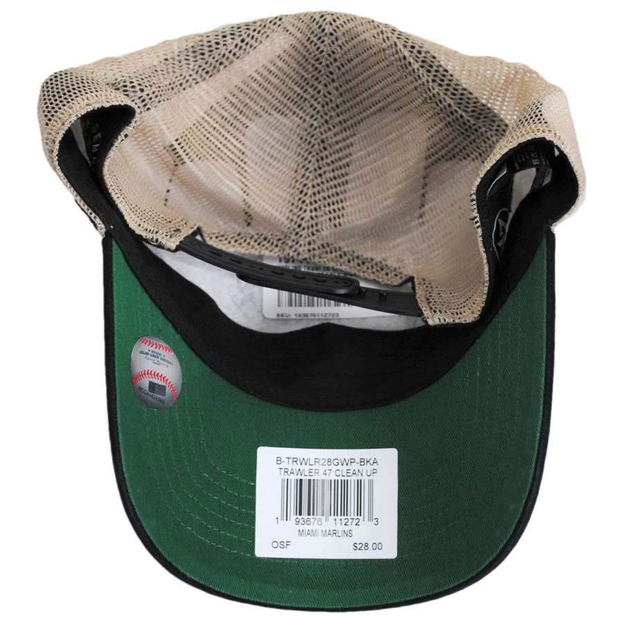 Featuring a soft classic 6-panel crown, 4 of which are mesh, the Miami Marlins Trawler 47 Mesh Clean Up Snapback Baseball Cap is all about comfort and relaxation. The front 2 panels are made of 100% cotton with a garment-washed twill finish, sewn eyelets and are adorned with an embroidered logo at the front. An embroidered ’47 Brand side hit, adjustable snapback, cotton twill sweatband and inseam taping complete this easy-going baseball cap.