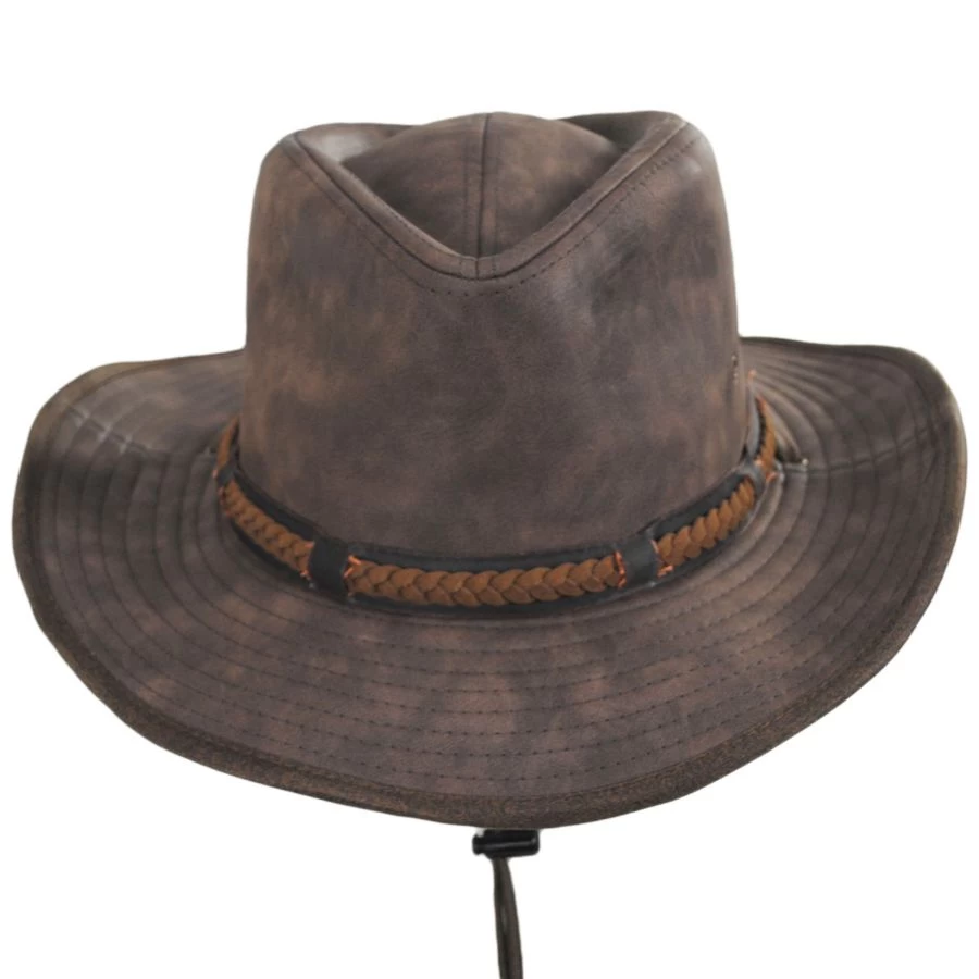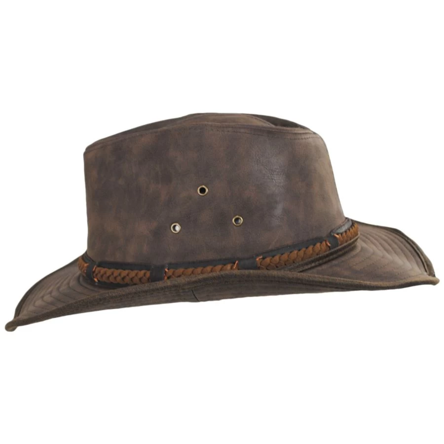 Dorfman Pacific Company’s Buster Vegan Leather Outback Hat blends the rugged style of a western with durable modern materials. The teardrop crown, weathered finish and faux leather braided hat band conjure thoughts of wide open spaces and a horse or two, while the medium width, wired shapeable brim is a classic outback detail. Metal eyelets have been added for extra breathability, allowing direct airflow to the crown’s interior.