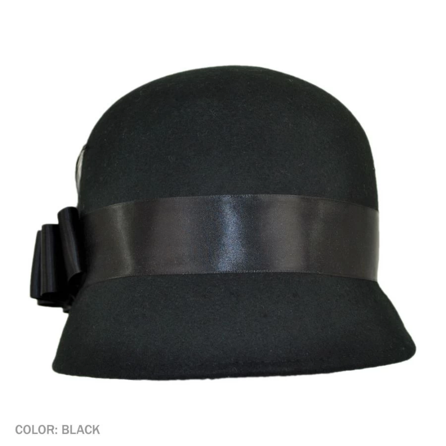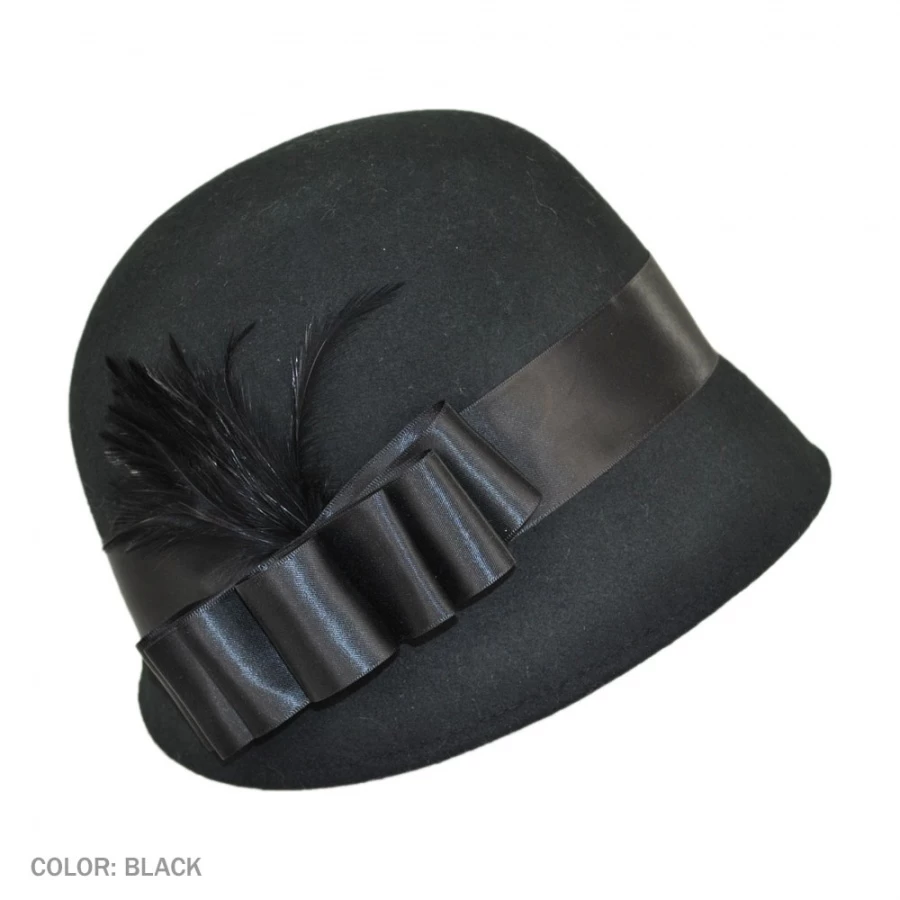 Take a step back in time with this stunning classic from sur la tete Hats. The Chloe Wool Felt Cloche Hat from sur la tete has a dimensional brim, trimmed with sleek soft feathers, an elegant satin band, and bow that makes this the perfect women’s dress hat for the season.