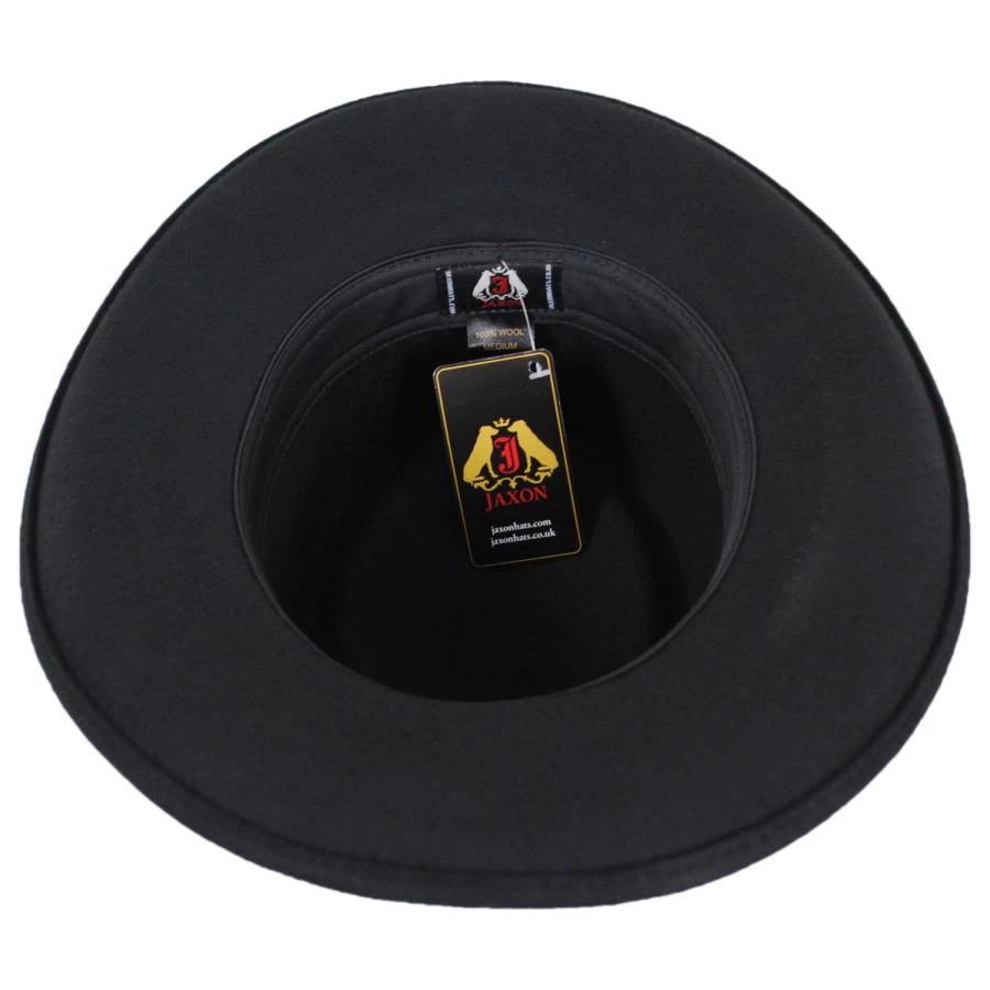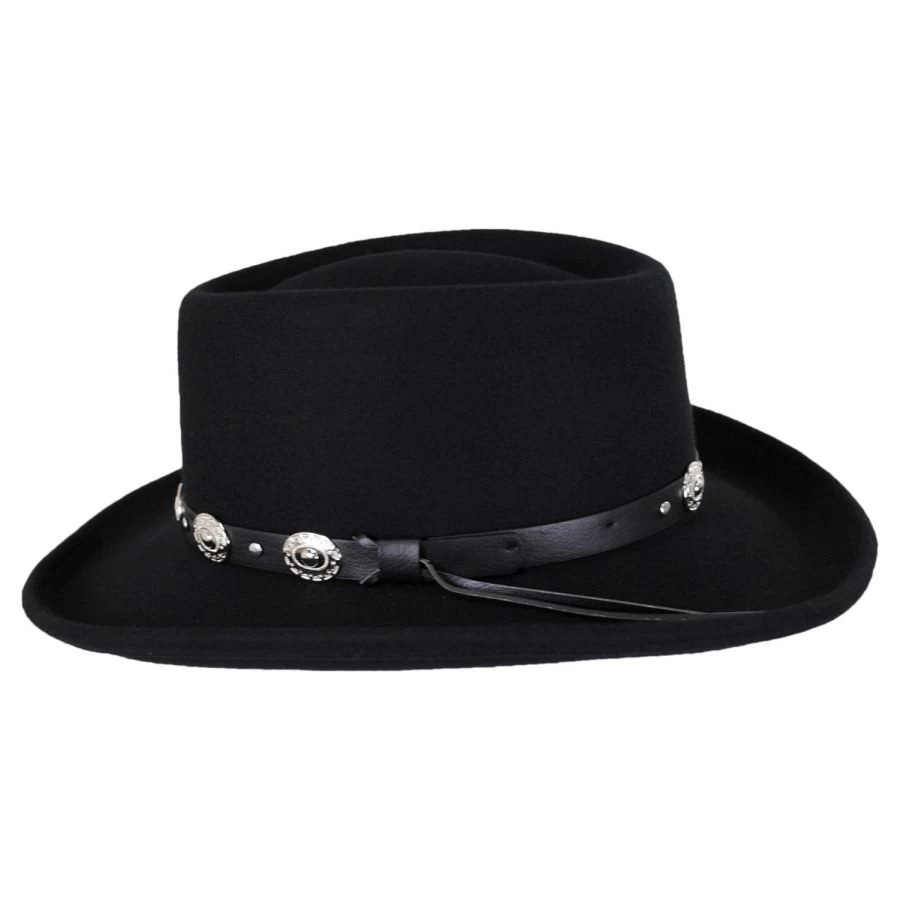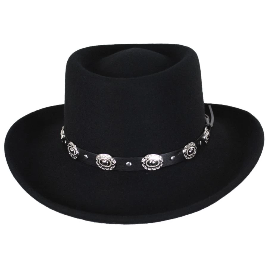 Looking for a gambler at an affordable price…the Crossfire Wool Felt Gambler Hat has been thoughtfully designed by Jaxon Hats to bring you a low-cost option of this popular hat shape. Packable/crushable and made of 100% wool, the Crossfire is adorned with a faux leather hat band. Silver metallic concho accents add flair and distinction while the simple unlined interior with cotton twill sweatband adds comfort and ease for the wearer.