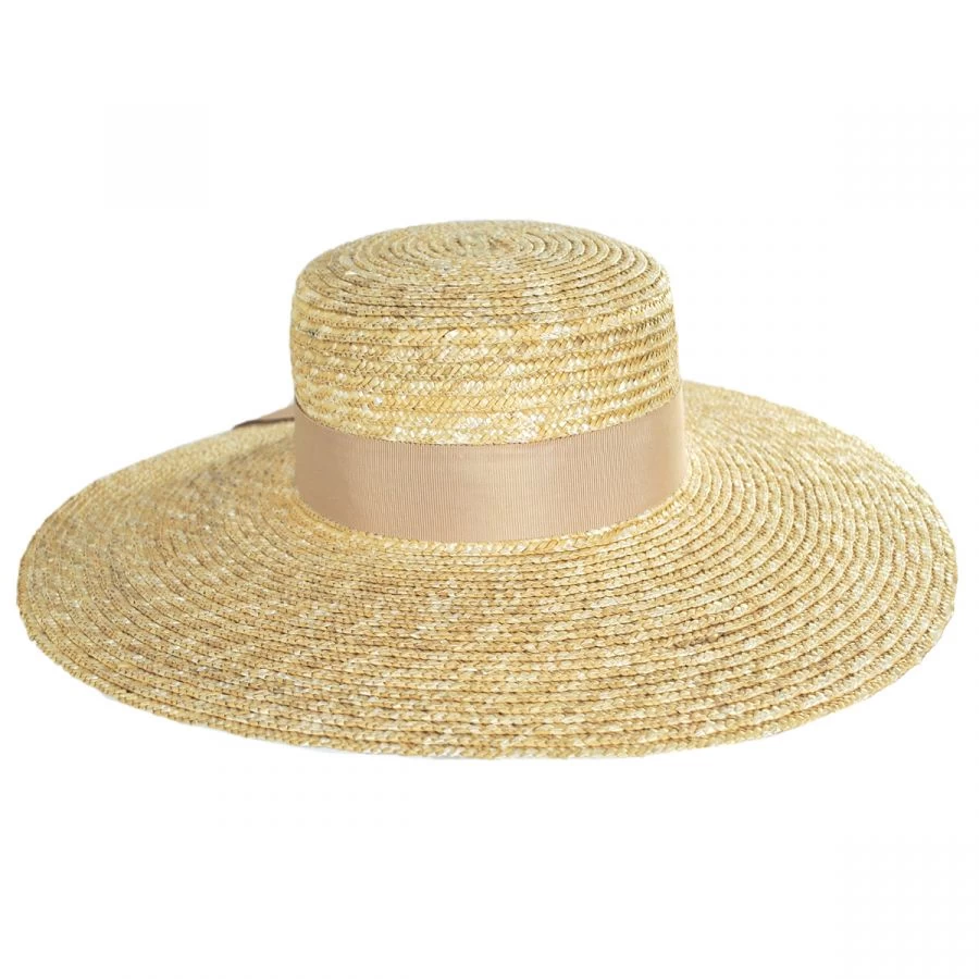 The Fiume Milan Straw Boater Hat is a flat brim boater hat by Jeanne Simmons. Features a sewn and braided straw build with a square crown. Add a touch of feminine charm with the tonal grosgrain ribbon hat band tied in a double bow. A standout style great for summer weather.