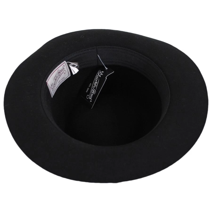 Stay bold with the Wheeler Wool Felt Fedora Hat by Goorin Bros! Features a raw edge, double layered grosgrain ribbon hat and a stingy brim. Designed in San Francisco, the Wheeler has a flexible finish and a comfortable cotton twill sweatband to ensure maximum comfort for the wearer.