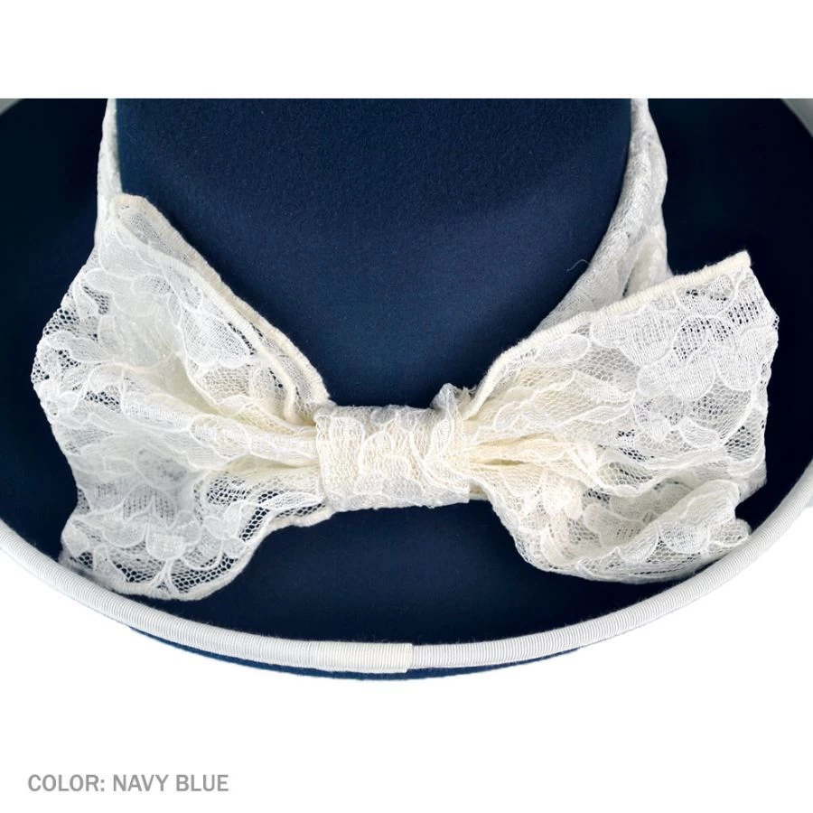 The Bollman Gibson Girl illustrates this style with its high squared crown, wide brim, soft navy felt and showy lace hat band tied off in a bow with a matching cream color binding.