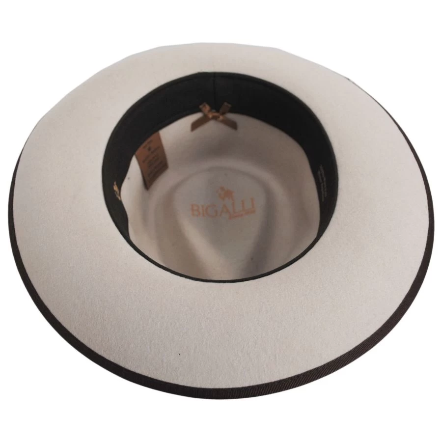 Bigalli is coming in strong with the Kellan Wool Felt Fedora Hat this fall! A striking fedora thanks to highly contrasting tones. Dark grosgrain ribbon adorns the crown and the binding on the brim of the Kellan and this beautifully sets off the lighter tone of the body. Features a flexible body and is water repellent. Made in Ecuador by Bigalli.