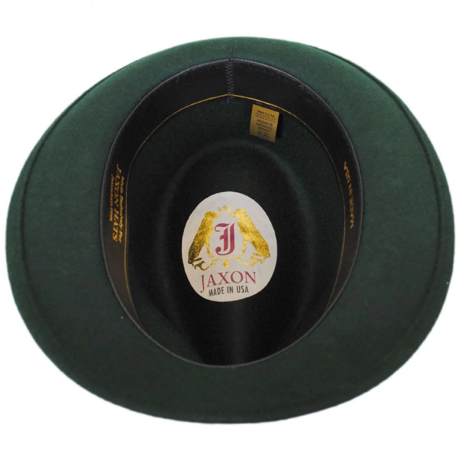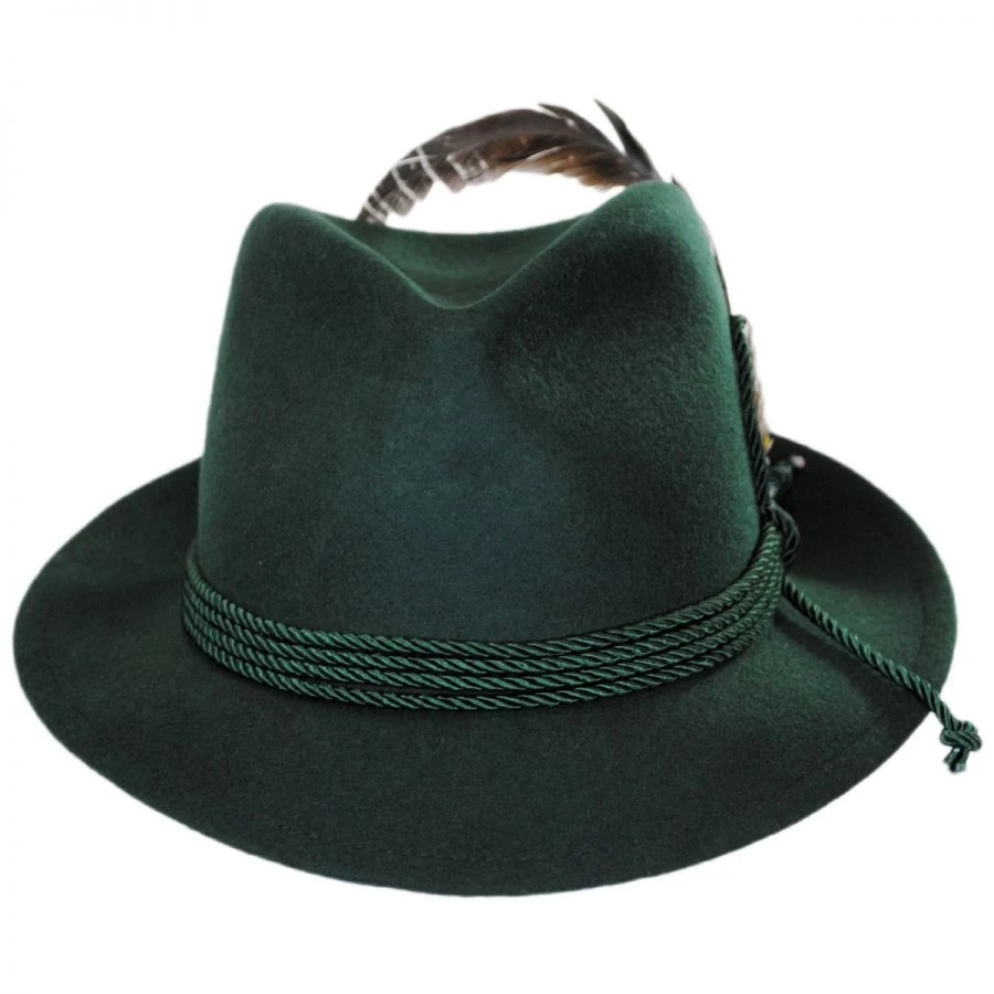 Introducing the Wool Felt Bavarian Hat, a new timeless addition to Jaxon Hats’ collection of USA-made Classics. Crafted of dark green, 100% wool felt, the Bavarian Hat is trimmed with traditional twisted green cord hat band, oversized removable side feather, leather sweatband and Jaxon crown tip detail. Great for completing your lederhosen outfit or for celebrating Octoberfest in authentic style, the Bavarian Wool Felt Hat is a must-have Alpine/Tyrolean addition to your hat collection!