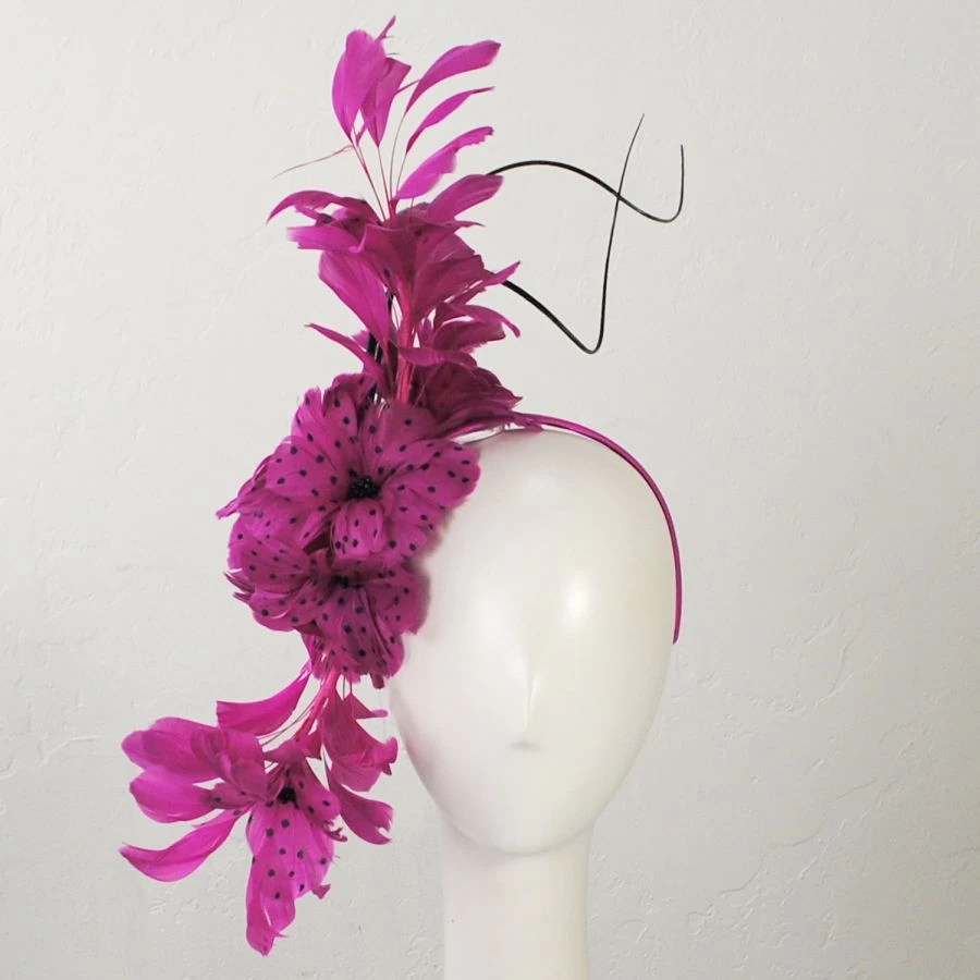 Designed by UK Milliner, Emma Linney, the Maud Polka Dot Feather Fascinator Hat from Emma B by Giovannio is a modern hit for polka dot fans. This fascinator is fun and classy, with feathers and quills. Plus, each polka dot is hand-painted! Features a satin covered headband with a grosgrain ribbon lining to ensure a secure fit.