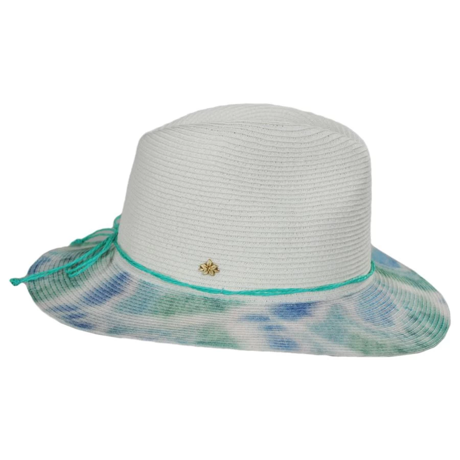 The Medodi Toyo Straw Fedora Hat from Cappelli Straworld is made of toyo straw that has been braided and shaped into a safari-style fedora. The 3 1/8″ brim has been given a tie-dye pattern which adds a burst of color. And the twisted toyo straw hat band adds even more color!