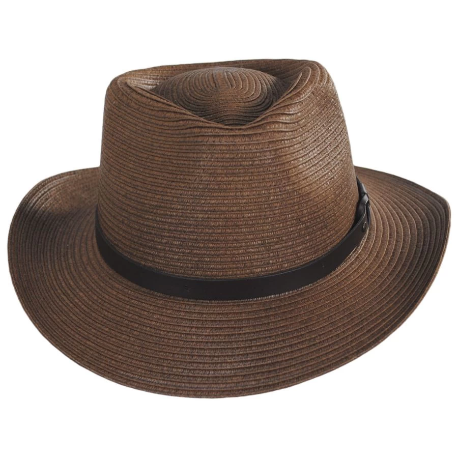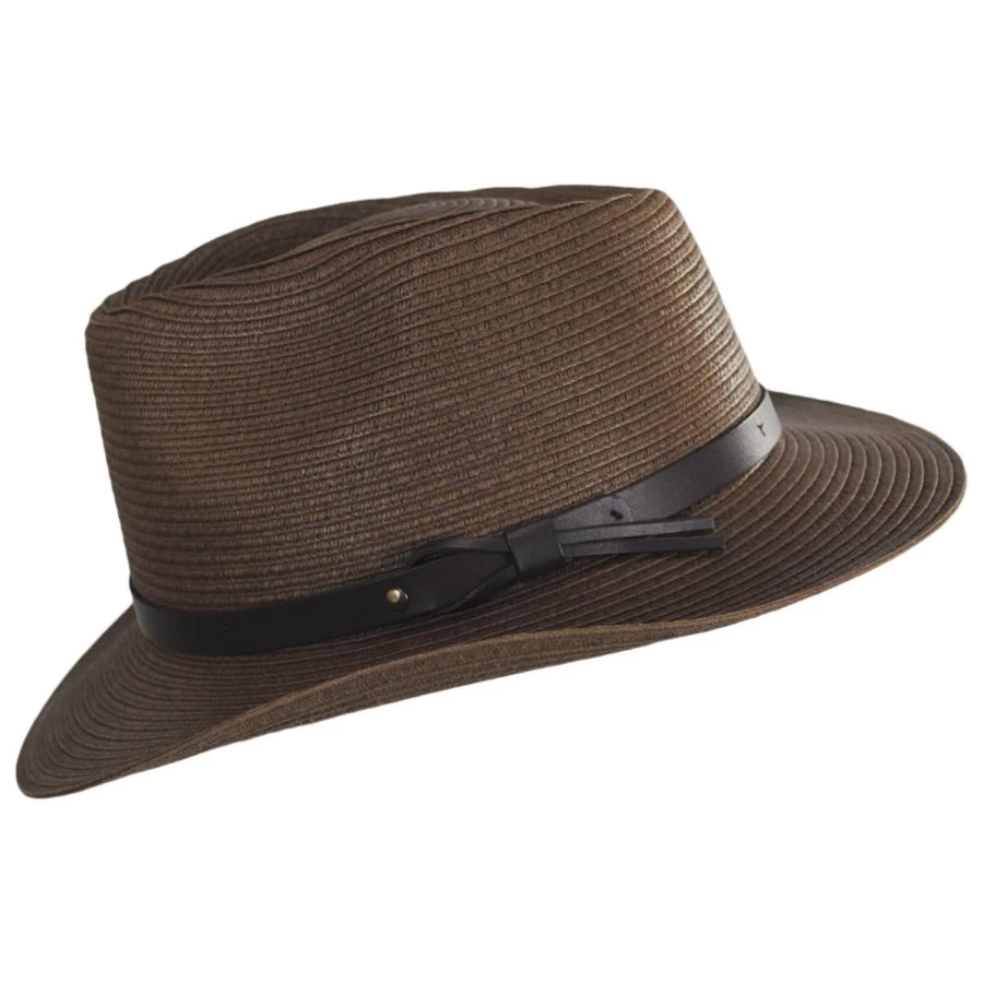 A little bit dramatic, the Melbourne Toyo Braid Outback Hat by Bigalli. With a curved brim and strong, stiff teardrop crown, this hat is a look! A recycled leather hat band with tassle details makes the Melbourne even more impressive
