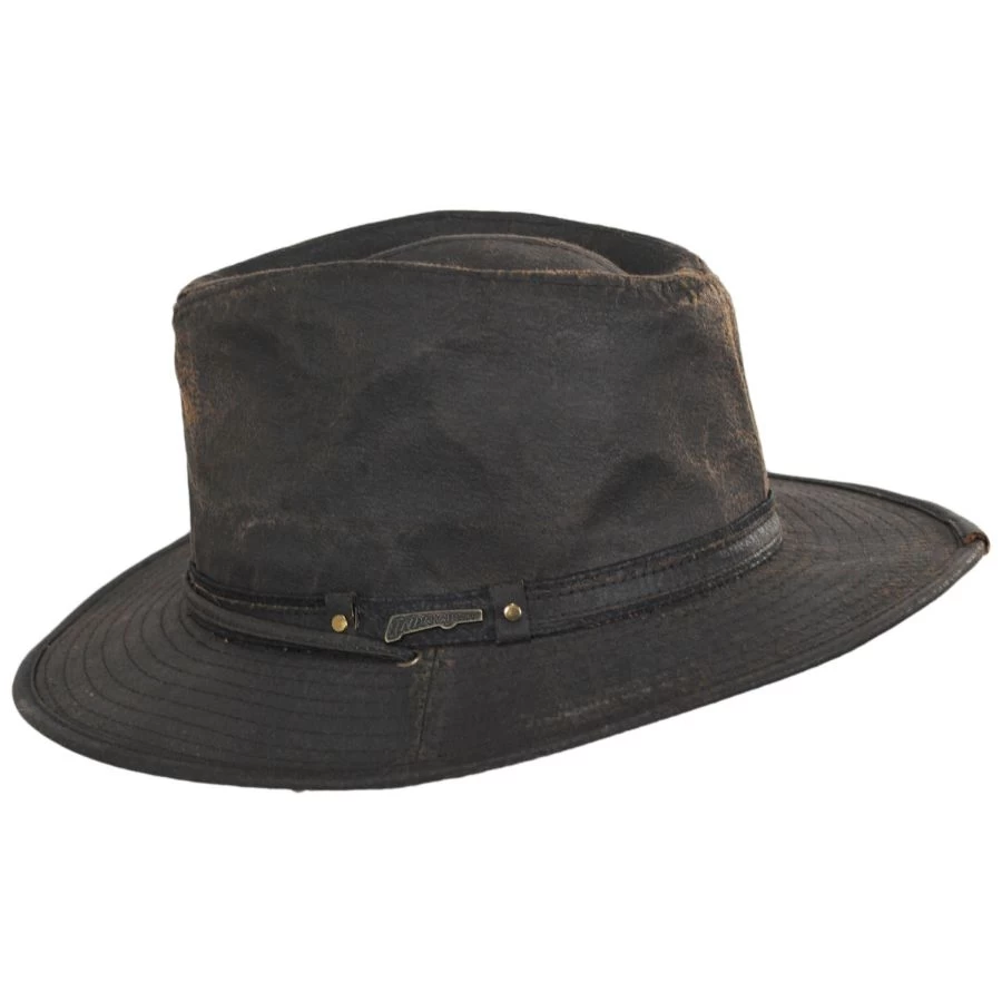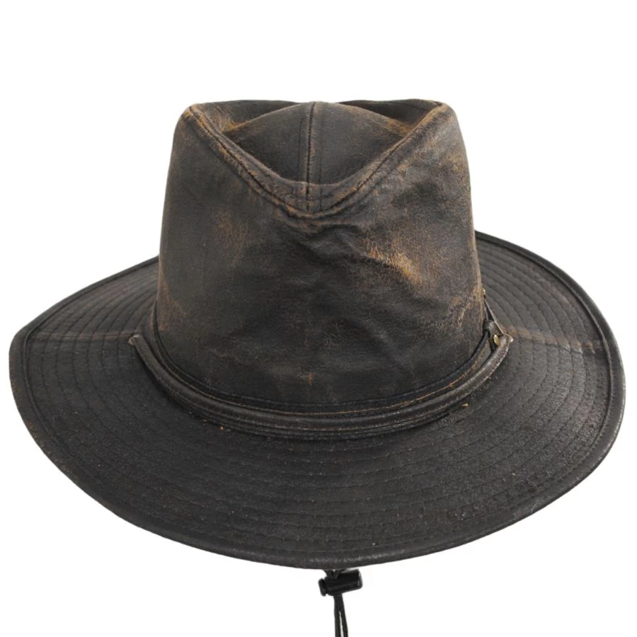 The officially licensed Weathered Cotton Blend Outback Hat by Indiana Jonesâ„¢ is for fans of all ages! With a wired shapeable brim, this hat has a weather finish, a signature of a seasoned explorer like Dr. Henry Jones, aka Indiana Jones. Other details include a wax cotton hat band, Indiana Jonesâ„¢ Pin and chin cord with adjustable toggle.