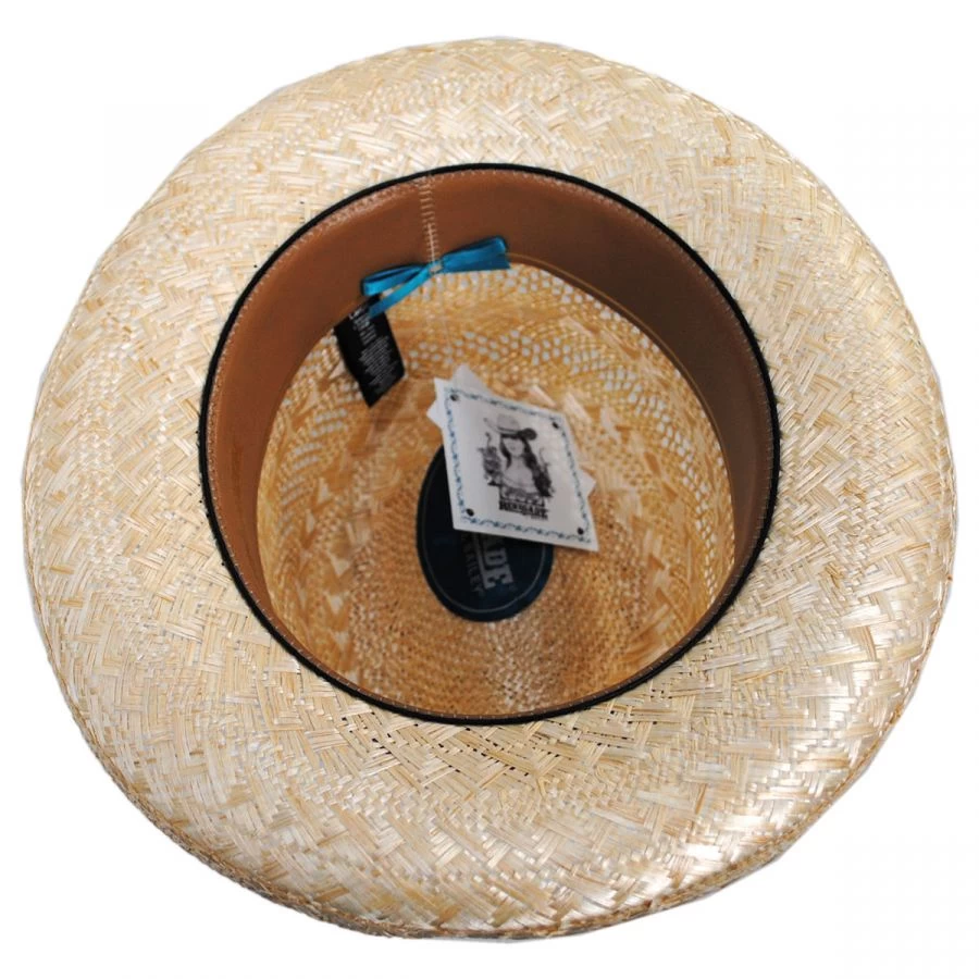 With the Shade Sisal Straw Homburg Hat by Renegade we get a fun and contemporary twist on the traditional homburg. The integrity of the silhouette has been maintained with the center dent crown and curled brim, however, the Shade is made of 100% sisal straw that has been crafted into an intricately woven pattern with a novelty vented crown. A snake skin patterned hat band accented with a large concho and feather finishes this stunning piece from Renegade.