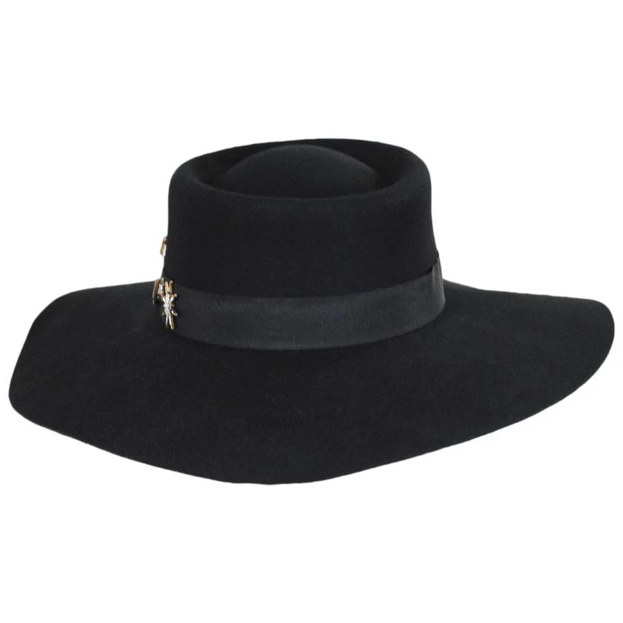 Turn your gaze to heavenly design with Scala’s Aphrodite Wool Felt Boater Hat. The Aphrodite is adorned with some beautiful charms in the shape of the moon and stars. These charms are the star of the show with other design elements being more minimalistic in approach. A grosgrain ribbon hat band seamlessly blends into the body of the hat, the raw edge brim makes for a no-fuss silhouette and the interior is unlined.
