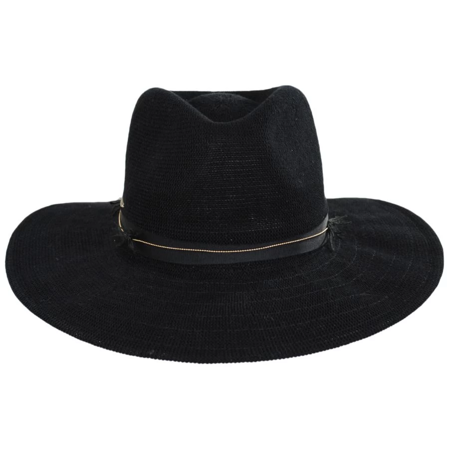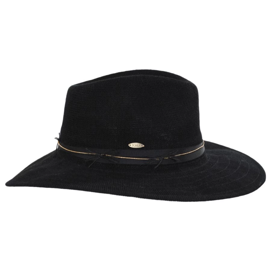 Scala’s Delvey Knit Fedora Hat is a packable hat made of a cotton blend knit, blocked into a wide brim fedora. Adorned with a multi-layered grosgrain ribbon hat band, accented with a delicate metallic chain. For added drama, frayed straw accent pieces have been strategically placed around the crown.