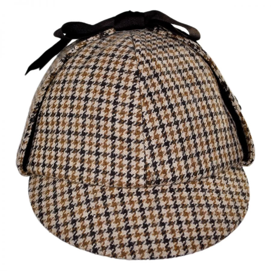 Whether you are a fan of Robert Downey Jr. or Benedict Cumberbatch as Sherlock, show your devotion with the Jaxon Hats Sherlock Holmes Hat. Along with the pipe, this deerstalker hat is a symbol of the world-renowned detective. Beige, tan and dark brown make up the classic houndstooth pattern; earflaps are secured with brown grosgrain ribbon ties.