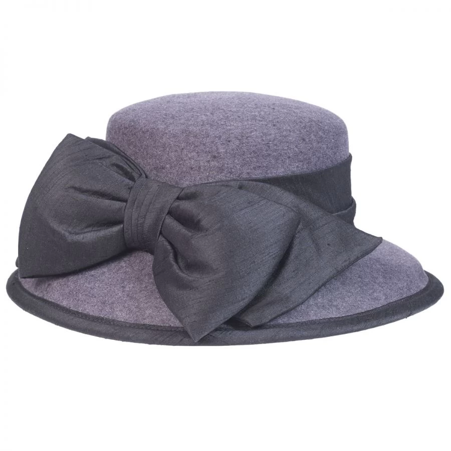 Featuring a classic lampshade dress hat design, the Silk Bow Wool Felt Lampshade Hat by Toucan is a lovely new dress hat for fall and winter. Crafted in the USA of soft and packable wool felt, this hat boasts a square crown (flat top, straight sides) and an elegant down-turned wide brim. Adorned with an oversized silk shantung bow and trim, this hat has a beautiful, vintage-inspired look you’ll love.Â