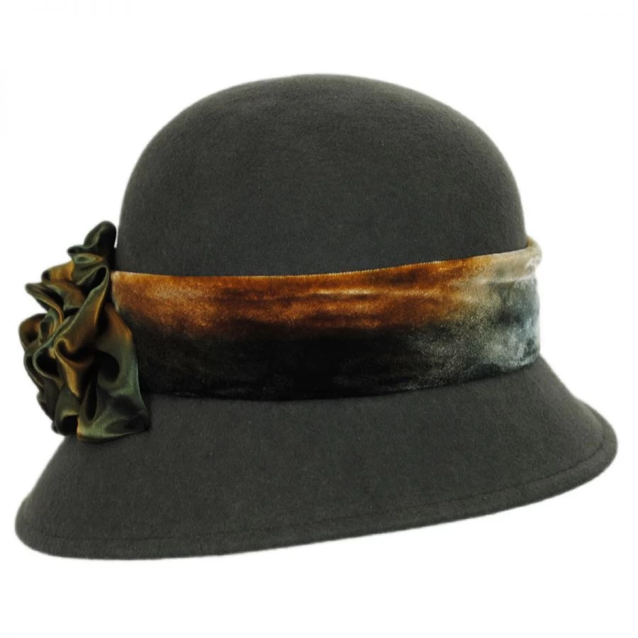 Featuring a stylish, asymmetrical brim and luxe ombre accents, the Silk Swirl Rose Wool Cloche Hat by Toucan is both elegant and deceptively simple. Handcrafted with care in the USA, the beauty of this style lies in the details — a luxurious velvet ombre hat band coordinating beautifully with a like-colored ombre silk rose placed precisely above the asymmetrical brim’s widest point.