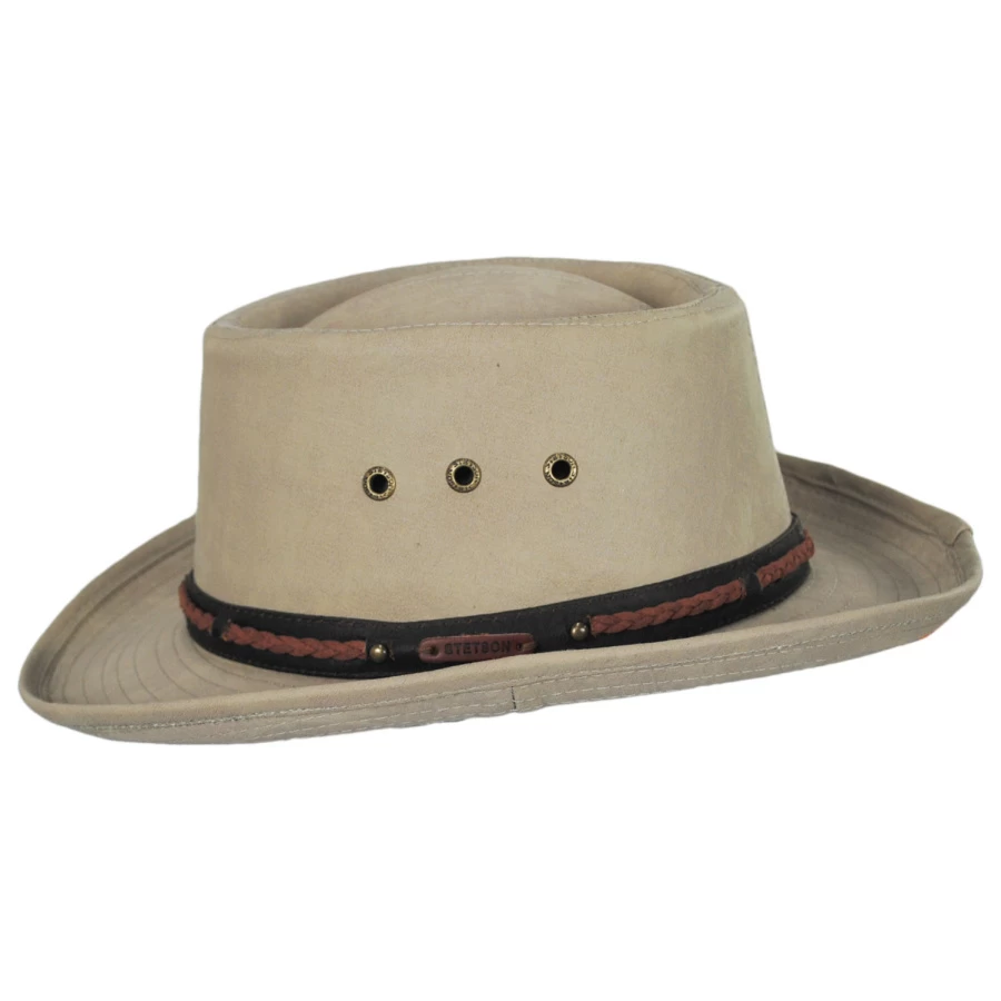 Be well prepared for your next adventure with the Gentleman Jim Cotton Blend Tiller Hat by Stetson. With 50+ sun protection rating, the water repellent finish will keep things dry while the metal eyelets will keep things cool. The waxed cotton hat band with a braided suede overlay adds a touch of fashion to this very practical hat.