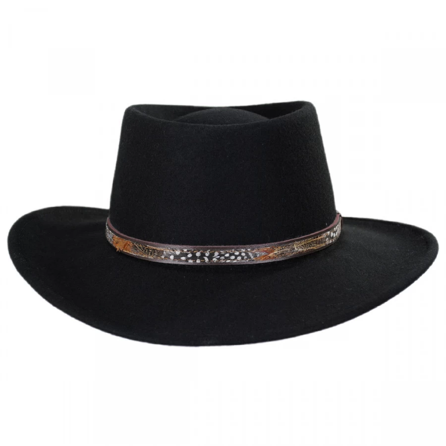 The Stetson Kelso Crushable Wool Felt Gambler Western Hat features a gambler-style crown crafted of crushable wool felt. Adorned with a faux leather hat band overlaid with feathers, the Kelso is finished with a Stetson metal side pin, slightly curved brim and absorbent DRI-LEX® sweatband. Its crushable (i.e. packable) nature makes this a great outdoor style while it also boasts the additional benefit of being water repellent.