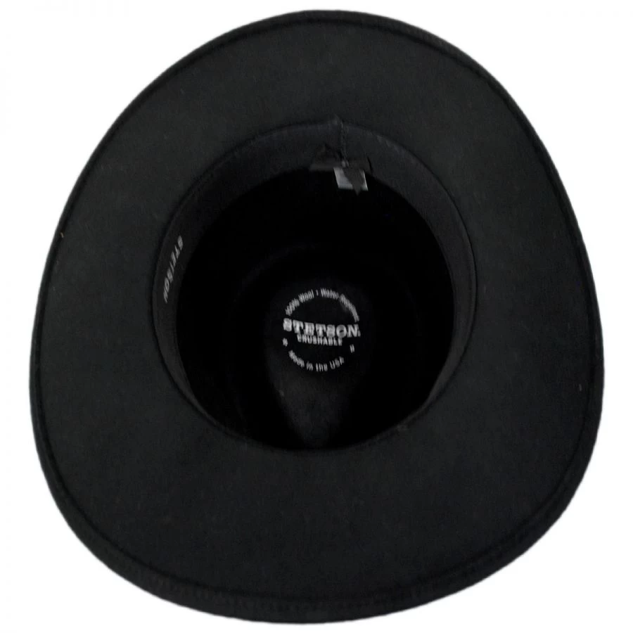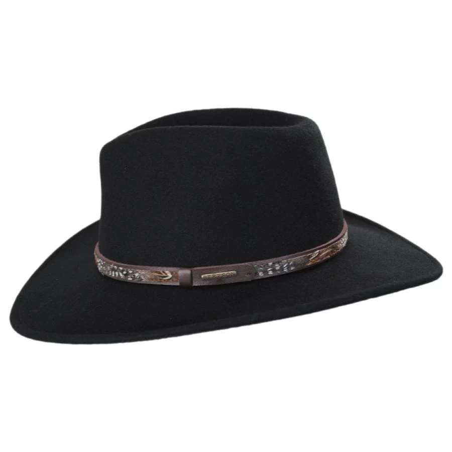 The epitome of true American craftsmanship is seen beautifully with the Linwood Crushable Wool Felt Outback Hat from Stetson. The faux leather hat band features pressed feathers, as well as a metallic Stetson label. Durable and comfortable, the Linwood is the perfect hat for any adventurer.