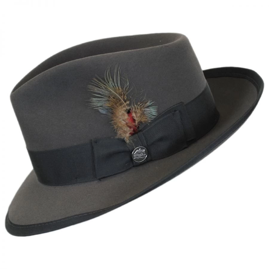 Part of Stetson’s Vintage Collection, the Stetson Whippet Fur Felt Fedora Hat is created with the finest Royal Deluxe Quality fur felt. Crafted with a smooth and delicate finish, this handsome fedora works well with many winter outfits, jackets and coats. The tonal grosgrain hat band wraps around the crown ending in a side bow and is finished with a side feather. Tonal grosgrain ribbon bounds the brim creating a sharp finished style.