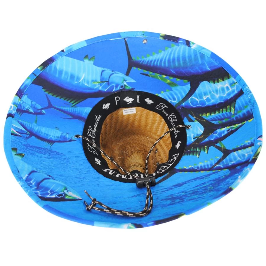 A lifeguard hat for all your sun activity needs, the Tuna Coconut Straw Lifeguard Hat by local San Diego company, Peter Grimm. Made of 100% coconut straw which has been constructed into a classic lifeguard hat design, the tuna fish-themed pattern on the under brim adds a touch of individuality. A functional hat band that also serves as a chin cord adds protection during windy conditions.