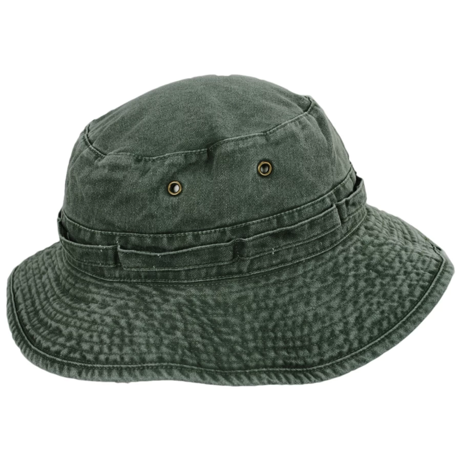 The Village Hat Shop offers a great basic 100% cotton booney hat. This hat is perfect for everyday wear, travelling and the great outdoors. The 100% washed cotton twill is soft yet durable while the pair of brass eyelets on each side of the crown provides ventilation under the hot sun. A self band (branch loops) provides spots for buttons or small outdoor tools. The adjustable chinstrap with toggle allows you to secure the hat onto your head as loosely or tightly as you like.