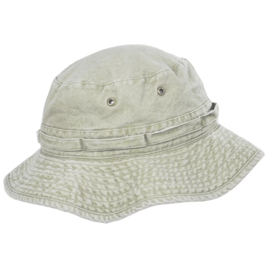 The Village Hat Shop offers a great basic 100% cotton booney hat. This hat is perfect for everyday wear, travelling and the great outdoors. The 100% washed cotton twill is soft yet durable while the pair of brass eyelets on each side of the crown provides ventilation under the hot sun. A self band (branch loops) provides spots for buttons or small outdoor tools. The adjustable chinstrap with toggle allows you to secure the hat onto your head as loosely or tightly as you like.