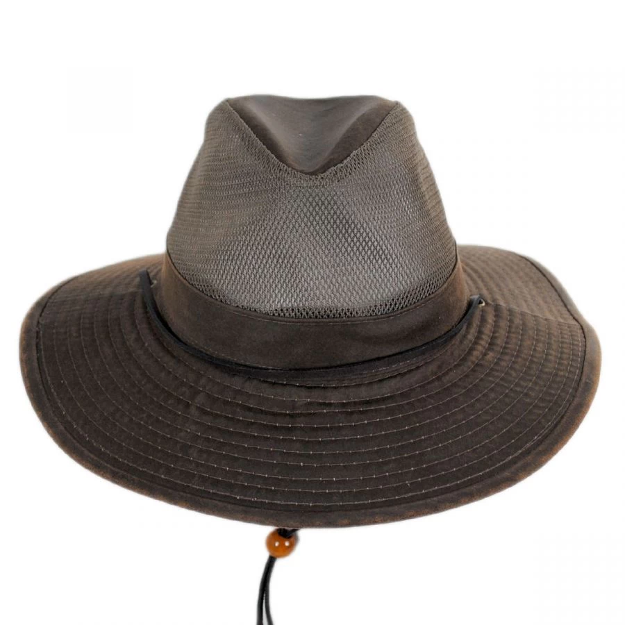 Beautifully crafted using a washing and weathering technique to give it a distressed finish, each Yargo Weathered Cotton Mesh Blend Aussie Fedora Hat by Dorfman Pacific Company is slightly different and unique. The vented crown thanks to mesh sidewalls allows for breathability and the 3″ brim will keep the sun rays off your face. A leather chin cord with toggle will keep the Yargo securely in place.